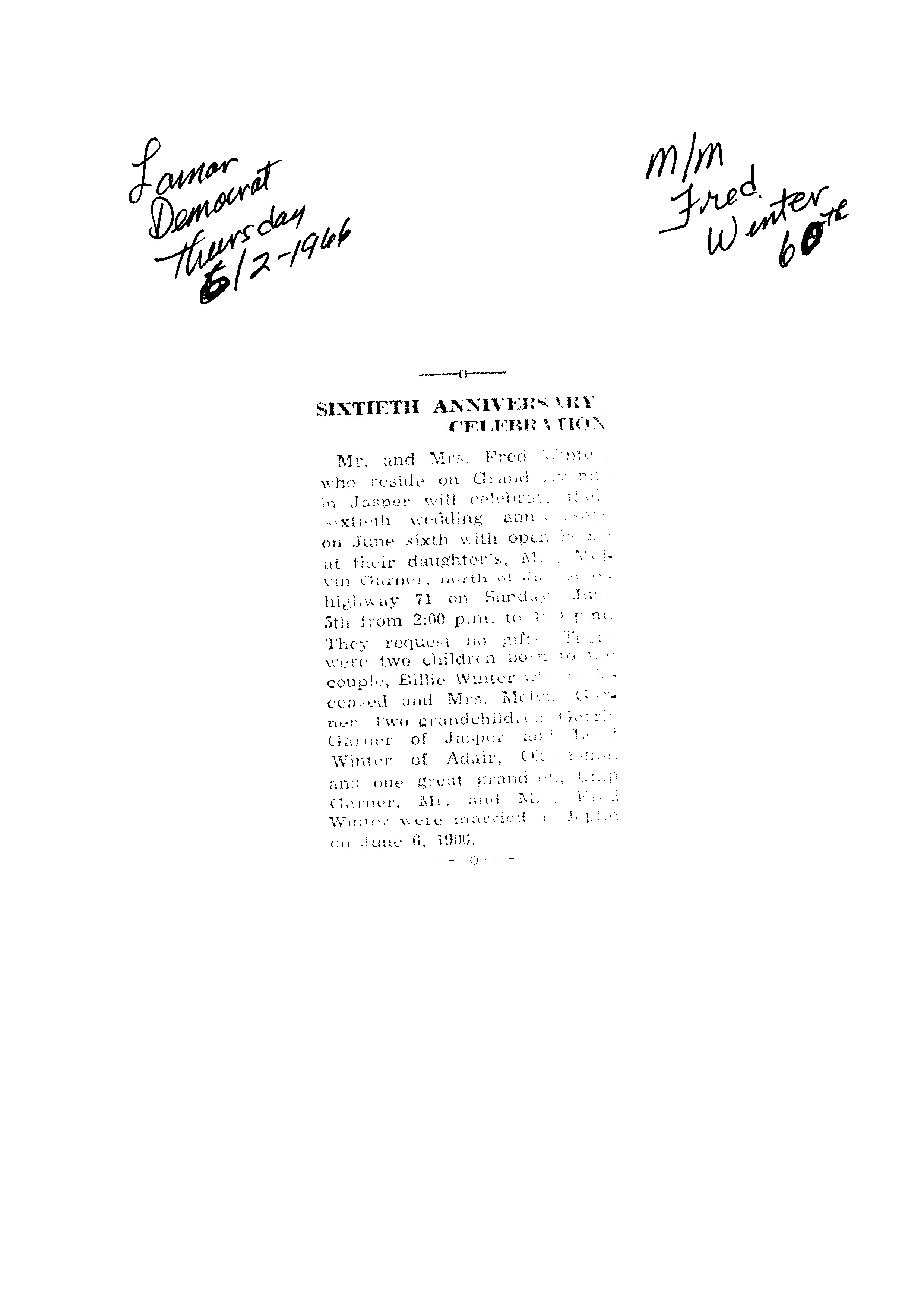 Winter's, Fred 60th